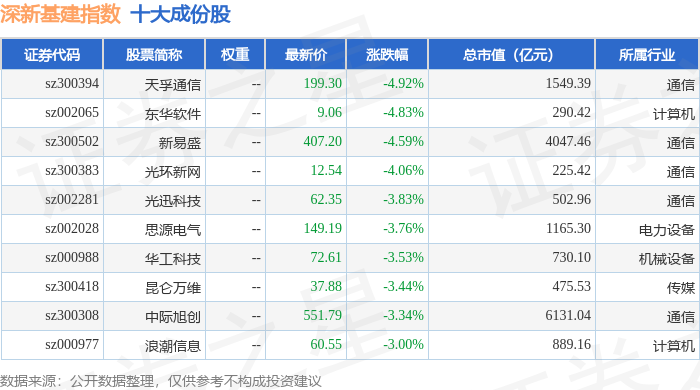 证券之星消息,12月16日,深新基建(399274)指数报收于5763.65点,跌2.12%,成交964.32亿元,换手率1.72%。当日该指数成份股中,上涨的有9家,四维图新以6.44%的涨幅领涨,下跌的有41家,天孚通信以4.92%的跌幅领跌。
