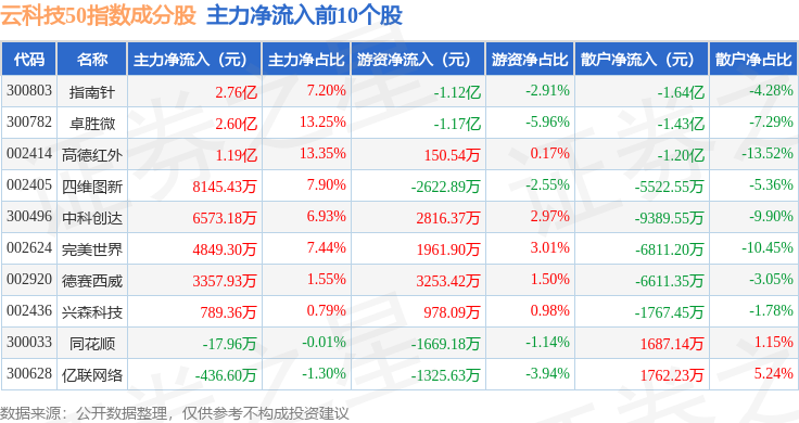 资金流向方面,云科技50(399279)指数成份股当日主力资金净流出合计67.84亿元,游资资金净流入合计34.44亿元,散户资金净流入合计33.4亿元。成份股资金流向详情见下表: