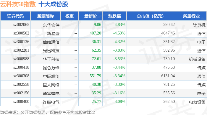云科技50(399279)指数十大成份股详情如下:
