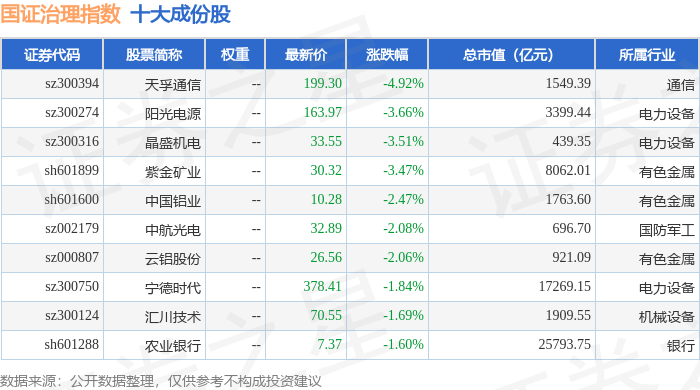 证券之星消息,12月16日,国证治理(399322)指数报收于10277.69点,跌0.92%,成交973.07亿元,换手率0.24%。当日该指数成份股中,上涨的有16家,长春高新以3.77%的涨幅领涨,下跌的有34家,天孚通信以4.92%的跌幅领跌。