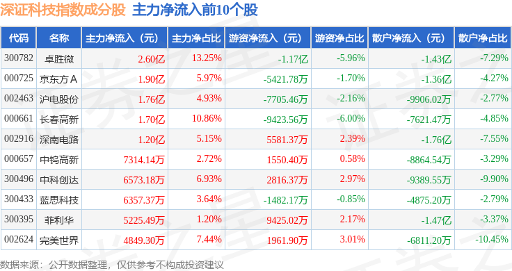 资金流向方面,深证科技(399339)指数成份股当日主力资金净流出合计89.76亿元,游资资金净流入合计23.18亿元,散户资金净流入合计66.58亿元。成份股资金流向详情见下表: