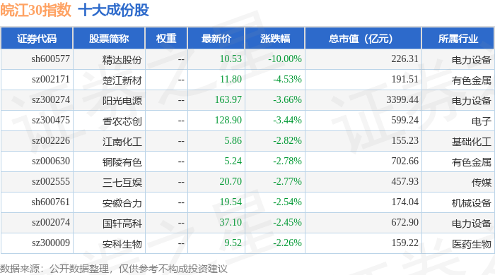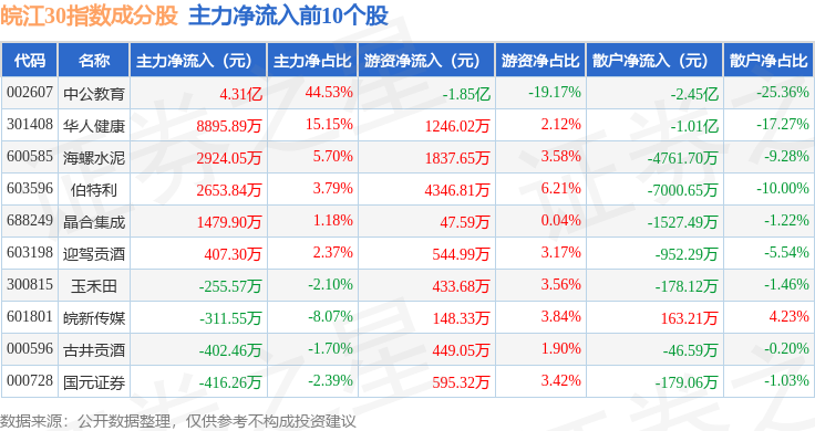 资金流向方面,皖江30(399350)指数成份股当日主力资金净流出合计32.0亿元,游资资金净流入合计8.18亿元,散户资金净流入合计23.82亿元。成份股资金流向详情见下表: