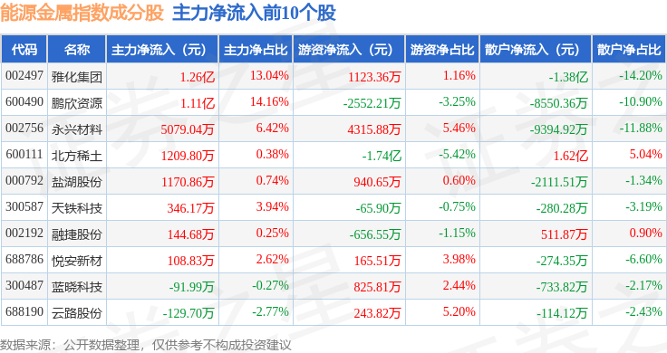 资金流向方面,能源金属(399366)指数成份股当日主力资金净流出合计32.97亿元,游资资金净流入合计4.0亿元,散户资金净流入合计28.9亿元。成份股资金流向详情见下表: