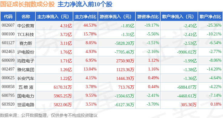 资金流向方面,国证成长(399370)指数成份股当日主力资金净流出合计196.87亿元,游资资金净流入合计56.1亿元,散户资金净流入合计140.54亿元。成份股资金流向详情见下表: