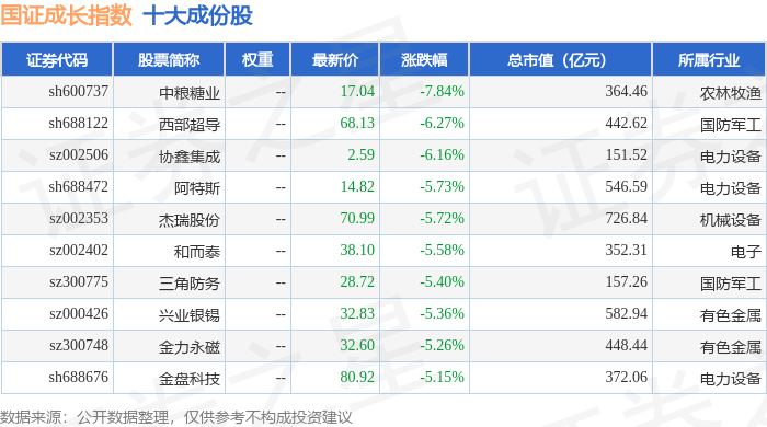 证券之星消息,12月16日,国证成长(399370)指数报收于4862.75点,跌1.55%,成交3054.29亿元,换手率0.98%。当日该指数成份股中,上涨的有59家,中公教育以9.92%的涨幅领涨,下跌的有270家,中粮糖业以7.84%的跌幅领跌。