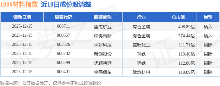近10日内1000材料(399382)指数成份股做了调整,新纳入了2只股票,剔除了4只股票。