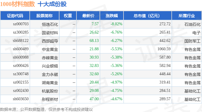 1000材料(399382)指数十大成份股详情如下:
