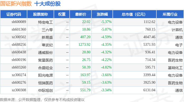 证券之星消息,12月16日,国证新兴(399392)指数报收于2864.82点,跌1.19%,成交2298.2亿元,换手率0.96%。当日该指数成份股中,上涨的有16家,中国卫通以5.13%的涨幅领涨,下跌的有84家,特变电工以5.37%的跌幅领跌。