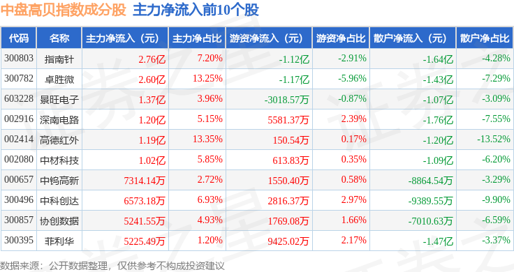 资金流向方面,中盘高贝(399407)指数成份股当日主力资金净流出合计78.94亿元,游资资金净流入合计13.56亿元,散户资金净流入合计65.38亿元。成份股资金流向详情见下表: