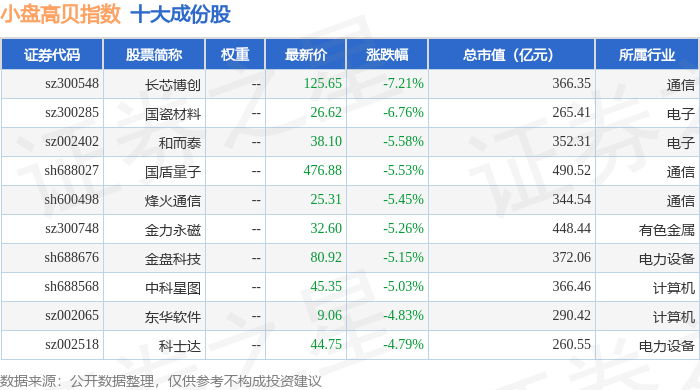 证券之星消息,12月16日,小盘高贝(399409)指数报收于5906.31点,跌2.02%,成交1061.21亿元,换手率2.75%。当日该指数成份股中,上涨的有18家,拉卡拉以5.23%的涨幅领涨,下跌的有132家,长芯博创以7.21%的跌幅领跌。