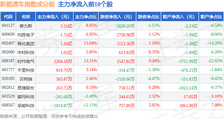 资金流向方面,新能源车(399417)指数成份股当日主力资金净流出合计43.21亿元,游资资金净流出合计3.38亿元,散户资金净流入合计46.48亿元。成份股资金流向详情见下表: