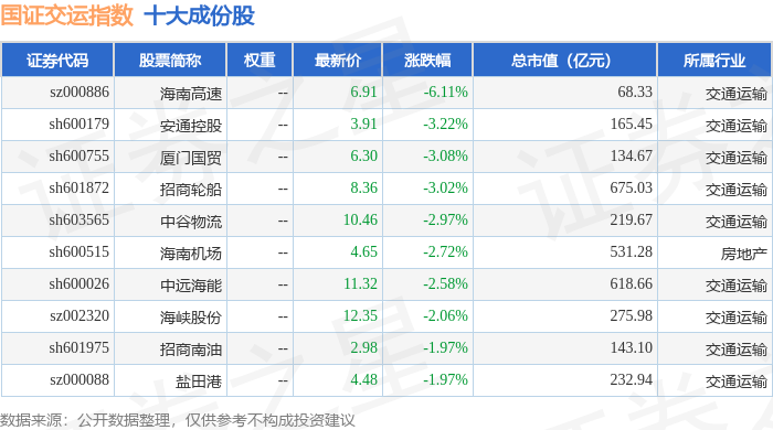 资金流向方面,国证交运(399433)指数成份股当日主力资金净流出合计7.58亿元,游资资金净流入合计2.11亿元,散户资金净流入合计5.47亿元。成份股资金流向详情见下表: