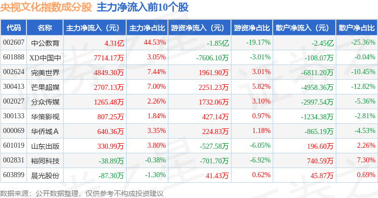 资金流向方面,央视文化(399557)指数成份股当日主力资金净流出合计18.47亿元,游资资金净流入合计2.73亿元,散户资金净流入合计15.75亿元。成份股资金流向详情见下表: