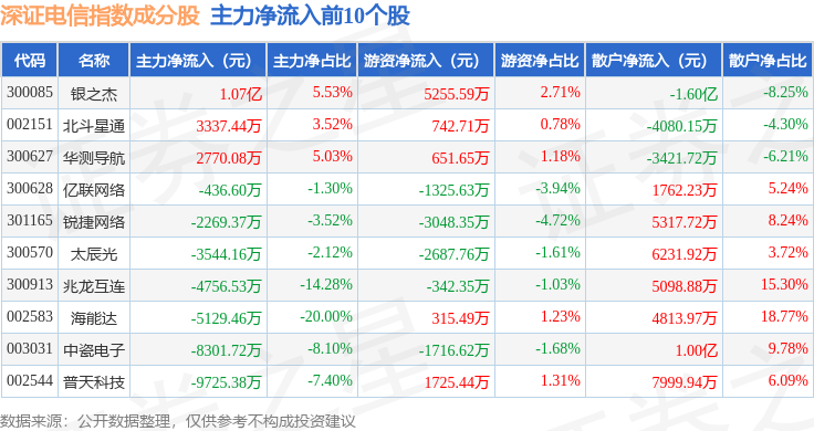 资金流向方面,深证电信(399621)指数成份股当日主力资金净流出合计58.67亿元,游资资金净流入合计31.47亿元,散户资金净流入合计27.2亿元。成份股资金流向详情见下表: