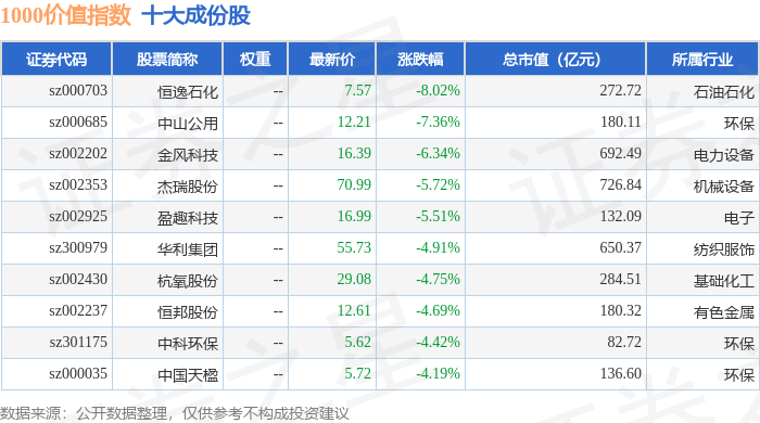 证券之星消息,12月16日,1000价值(399631)指数报收于2183.03点,跌1.08%,成交1273.54亿元,换手率1.23%。当日该指数成份股中,上涨的有62家,红旗连锁以9.95%的涨幅领涨,下跌的有266家,恒逸石化以8.02%的跌幅领跌。