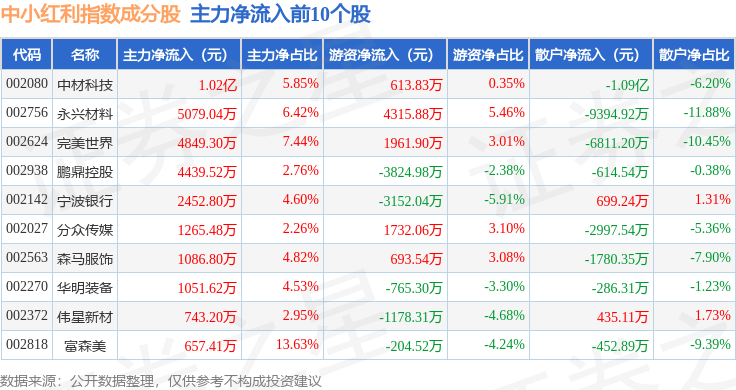 资金流向方面,中小红利(399649)指数成份股当日主力资金净流出合计5.52亿元,游资资金净流入合计7051.07万元,散户资金净流入合计4.82亿元。成份股资金流向详情见下表: