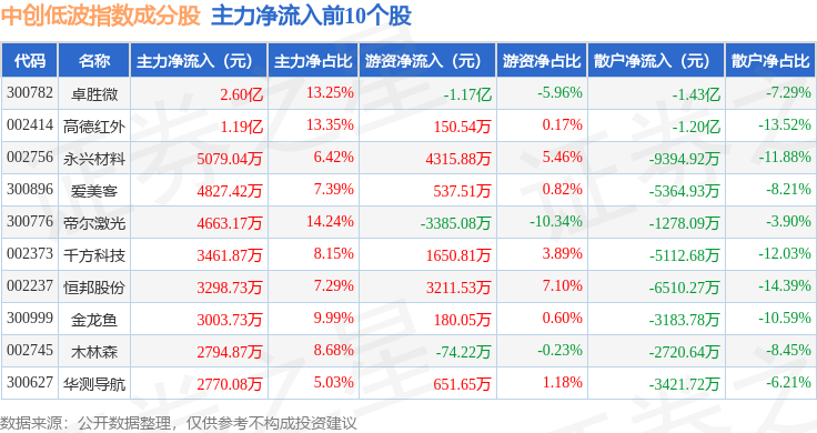 资金流向方面,中创低波(399665)指数成份股当日主力资金净流出合计51.45亿元,游资资金净流入合计7.28亿元,散户资金净流入合计44.17亿元。成份股资金流向详情见下表: