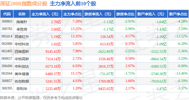 资金流向方面,深证200R(399679)指数成份股当日主力资金净流出合计94.88亿元,游资资金净流入合计5.92亿元,散户资金净流入合计88.96亿元。成份股资金流向详情见下表: