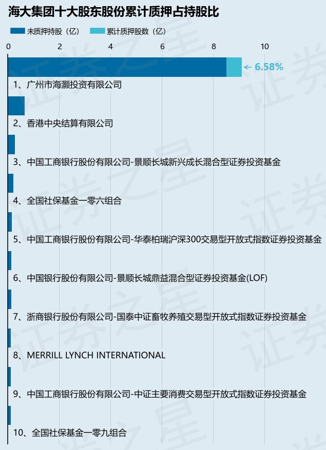 截止本公告日,股东广州市海灏投资有限公司已累计质押股份5996.0万股,占其持股总数的6.58%。本次质押后海大集团十大股东的累计质押股份占持股比例(占持股比例的计算以公司最新一期财务报表公布的十大股东的持股总数为基准)见下图: