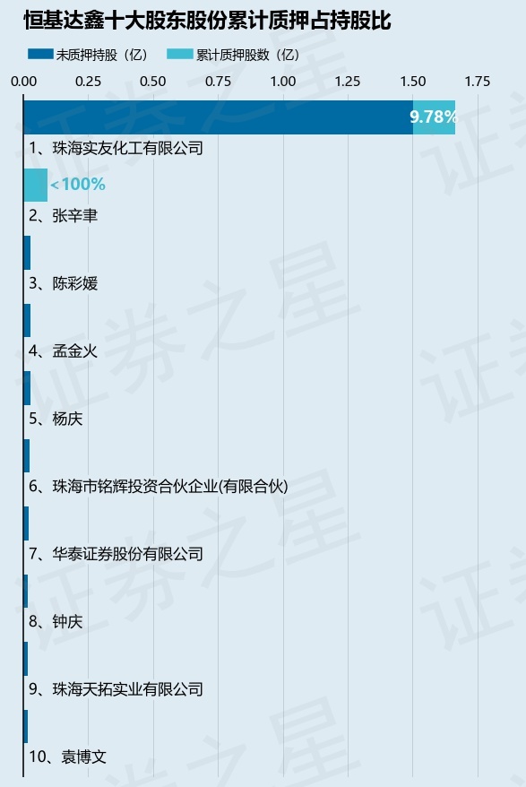 截止本公告日,股东珠海实友化工有限公司已累计质押股份1627.0万股,占其持股总数的9.78%,股东张辛聿已累计质押股份915.0万股,占其持股总数的100.0%。本次质押后恒基达鑫十大股东的累计质押股份占持股比例(占持股比例的计算以公司最新一期财务报表公布的十大股东的持股总数为基准)见下图: