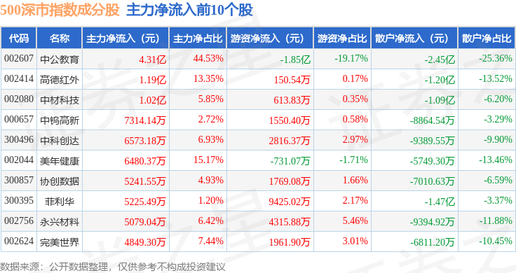 资金流向方面,500深市(399802)指数成份股当日主力资金净流出合计98.67亿元,游资资金净流入合计8.05亿元,散户资金净流入合计90.62亿元。成份股资金流向详情见下表: