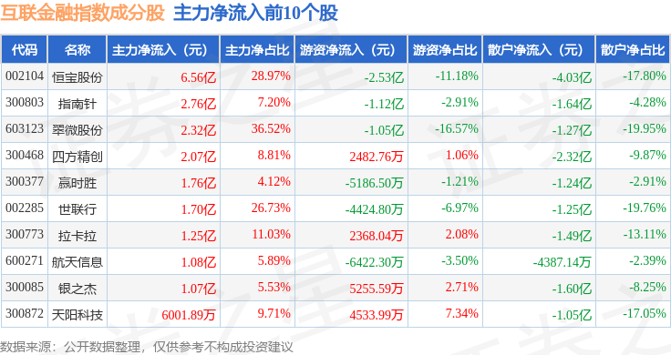 资金流向方面,互联金融(399805)指数成份股当日主力资金净流入合计8.89亿元,游资资金净流出合计1.73亿元,散户资金净流出合计6.82亿元。成份股资金流向详情见下表: