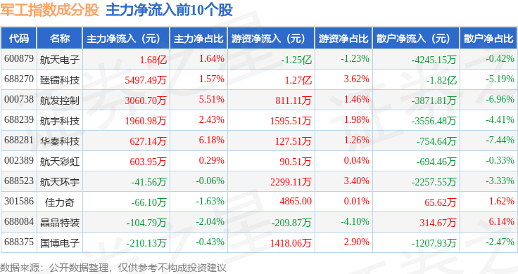 资金流向方面,军工指数(399959)成份股当日主力资金净流出合计14.48亿元,游资资金净流入合计4.11亿元,散户资金净流入合计10.37亿元。成份股资金流向详情见下表: