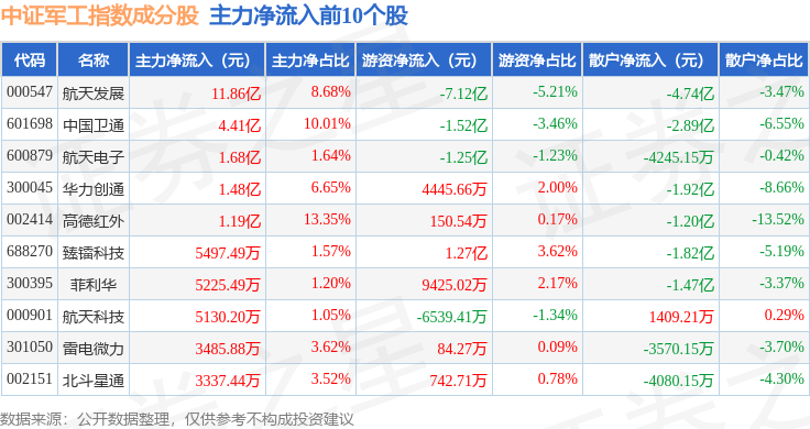 资金流向方面,中证军工(399967)指数成份股当日主力资金净流出合计26.05亿元,游资资金净流出合计1.71亿元,散户资金净流入合计27.76亿元。成份股资金流向详情见下表: