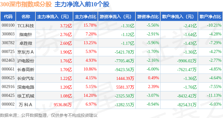 资金流向方面,300深市(399972)指数成份股当日主力资金净流出合计101.82亿元,游资资金净流入合计35.45亿元,散户资金净流入合计66.37亿元。成份股资金流向详情见下表: