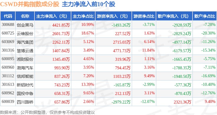 资金流向方面,CSWD并购(399992)指数成份股当日主力资金净流出合计28.53亿元,游资资金净流入合计8054.33万元,散户资金净流入合计27.52亿元。成份股资金流向详情见下表: