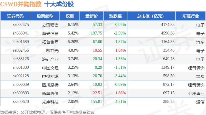 CSWD并购(399992)指数十大成份股详情如下:
