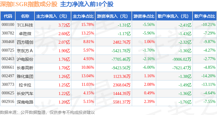 资金流向方面,深指ESGR(470026)指数成份股当日主力资金净流出合计203.59亿元,游资资金净流入合计32.96亿元,散户资金净流入合计170.63亿元。成份股资金流向详情见下表: