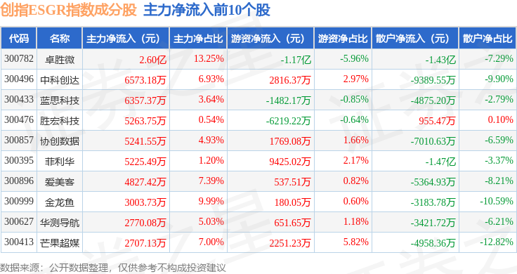 资金流向方面,创指ESGR(470028)指数成份股当日主力资金净流出合计87.97亿元,游资资金净流入合计19.97亿元,散户资金净流入合计68.0亿元。成份股资金流向详情见下表: