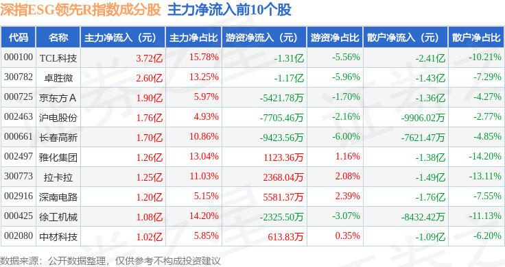 资金流向方面,深指ESG领先R(470029)指数成份股当日主力资金净流出合计119.51亿元,游资资金净流入合计23.02亿元,散户资金净流入合计96.48亿元。成份股资金流向详情见下表: