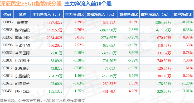 资金流向方面,深证民企ESGR(470056)指数成份股当日主力资金净流出合计62.45亿元,游资资金净流入合计7795.49万元,散户资金净流入合计61.67亿元。成份股资金流向详情见下表: