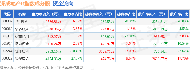 资金流向方面,深成地产R(471001)指数成份股当日主力资金净流入合计3602.24万元,游资资金净流入合计3160.8万元,散户资金净流出合计6763.03万元。成份股资金流向详情见下表:
