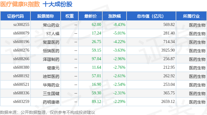 资金流向方面,医疗健康R(480016)指数成份股当日主力资金净流出合计15.81亿元,游资资金净流入合计2.62亿元,散户资金净流入合计13.19亿元。成份股资金流向详情见下表: