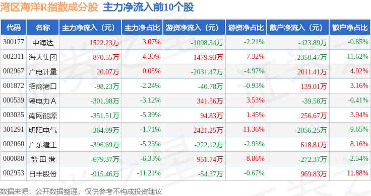 资金流向方面,湾区海洋R(480019)指数成份股当日主力资金净流出合计3.35亿元,游资资金净流出合计3593.88万元,散户资金净流入合计3.71亿元。成份股资金流向详情见下表: