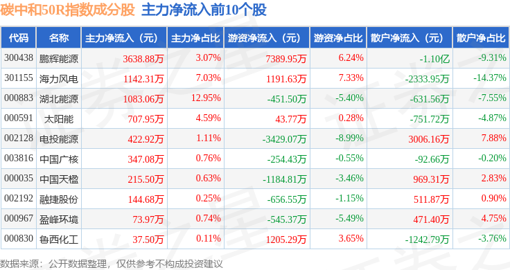 资金流向方面,碳中和50R(480021)指数成份股当日主力资金净流出合计22.52亿元,游资资金净流出合计8439.08万元,散户资金净流入合计23.36亿元。成份股资金流向详情见下表: