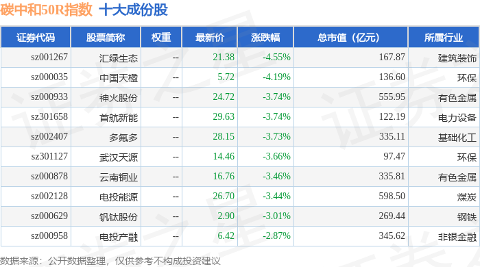 碳中和50R(480021)指数十大成份股详情如下: