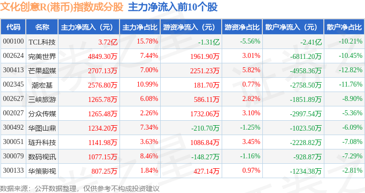 资金流向方面,文化创意R(港币)(480047)指数成份股当日主力资金净流出合计18.34亿元,游资资金净流入合计2.64亿元,散户资金净流入合计15.7亿元。成份股资金流向详情见下表: