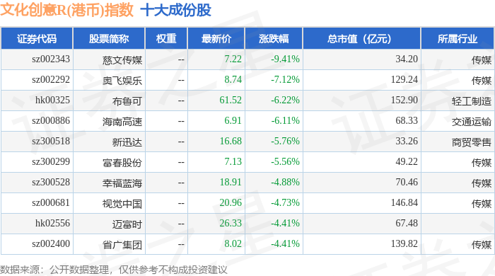 文化创意R(港币)(480047)指数十大成份股详情如下: