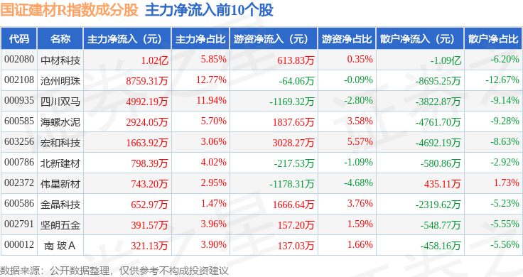 资金流向方面,国证建材R(480048)指数成份股当日主力资金净流入合计4268.26万元,游资资金净流入合计2.06亿元,散户资金净流出合计2.49亿元。成份股资金流向详情见下表: