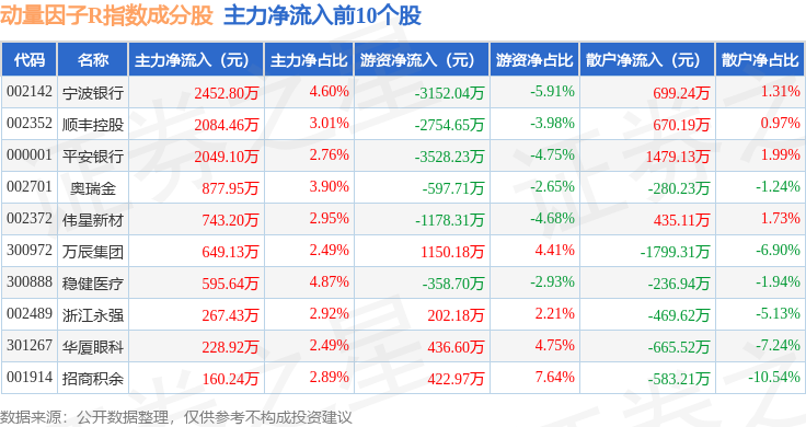 资金流向方面,动量因子R(480057)指数成份股当日主力资金净流出合计12.51亿元,游资资金净流出合计1793.73万元,散户资金净流入合计12.69亿元。成份股资金流向详情见下表: