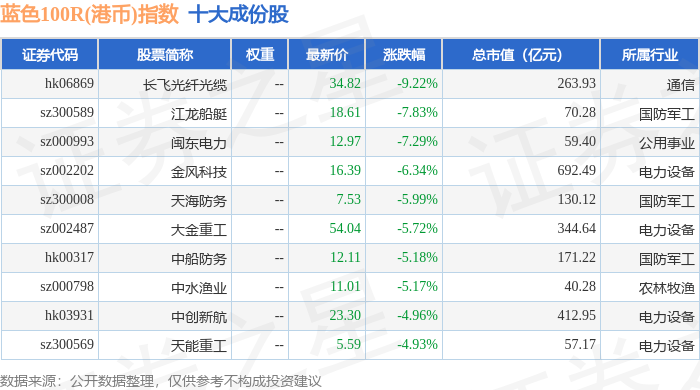 蓝色100R(港币)(480069)指数十大成份股详情如下: