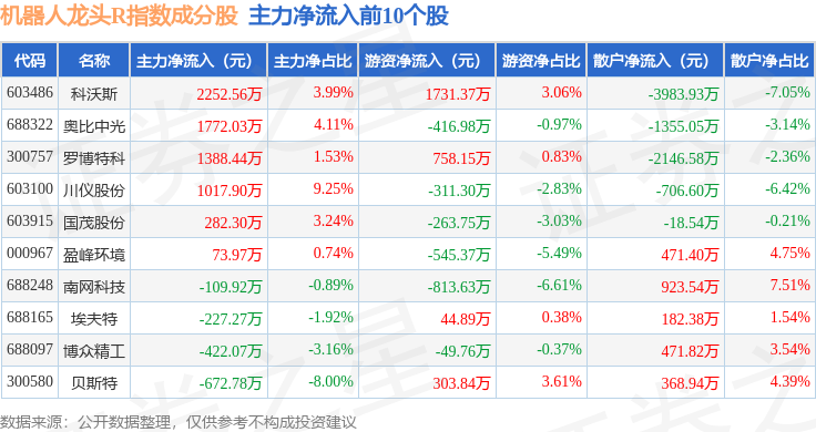 资金流向方面,机器人龙头R(480071)指数成份股当日主力资金净流出合计20.74亿元,游资资金净流入合计3.37亿元,散户资金净流入合计17.38亿元。成份股资金流向详情见下表: