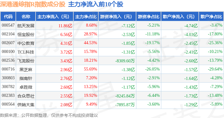 资金流向方面,深港通综指R(483005)指数成份股当日主力资金净流出合计390.6亿元,游资资金净流入合计63.89亿元,散户资金净流入合计326.71亿元。成份股资金流向详情见下表: