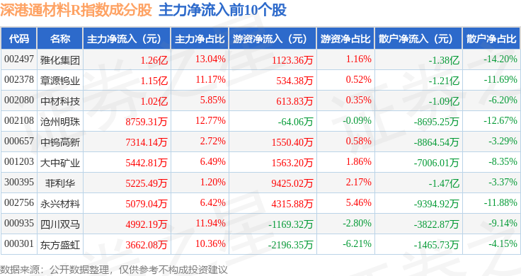 资金流向方面,深港通材料R(483015)指数成份股当日主力资金净流出合计63.07亿元,游资资金净流入合计12.3亿元,散户资金净流入合计50.78亿元。成份股资金流向详情见下表: