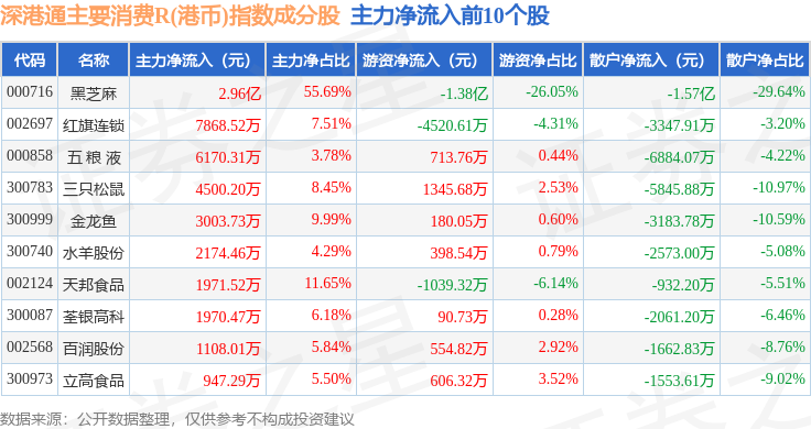 资金流向方面,深港通主要消费R(港币)(483022)指数成份股当日主力资金净流出合计3.16亿元,游资资金净流出合计9054.07万元,散户资金净流入合计4.06亿元。成份股资金流向详情见下表: