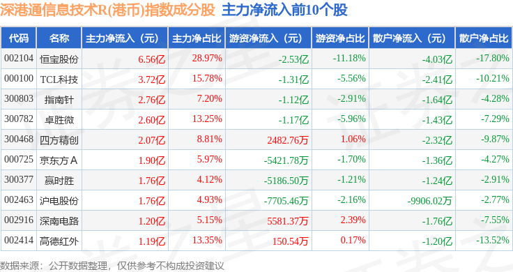 资金流向方面,深港通信息技术R(港币)(483028)指数成份股当日主力资金净流出合计83.24亿元,游资资金净流入合计12.14亿元,散户资金净流入合计71.1亿元。成份股资金流向详情见下表: